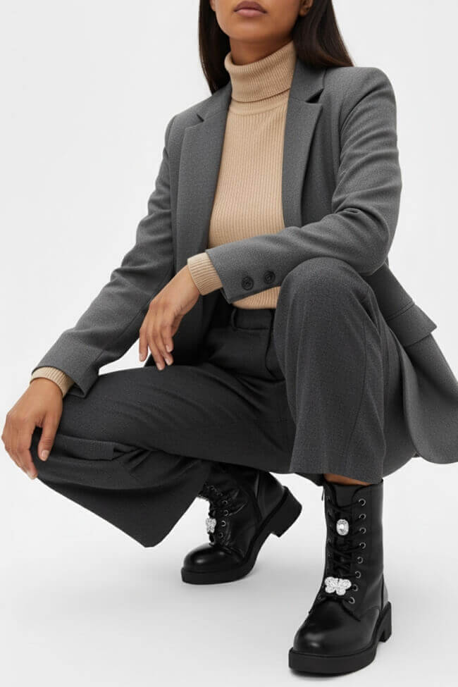 - Dacă îți plac piesele minimaliste, poți alege modele mai clasice, cum ar fi biker boots în paletă monocromă, care se potrivesc cu orice.