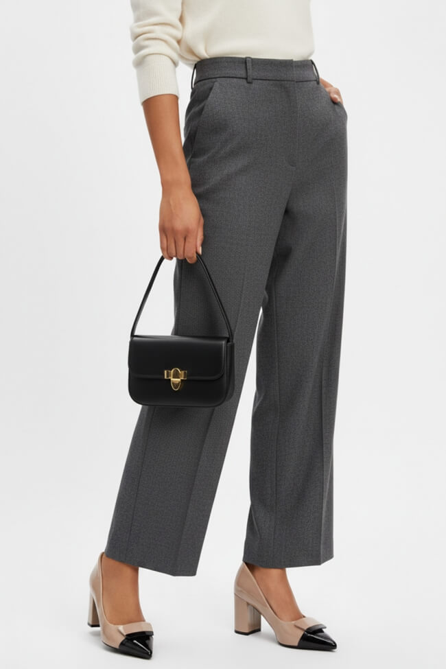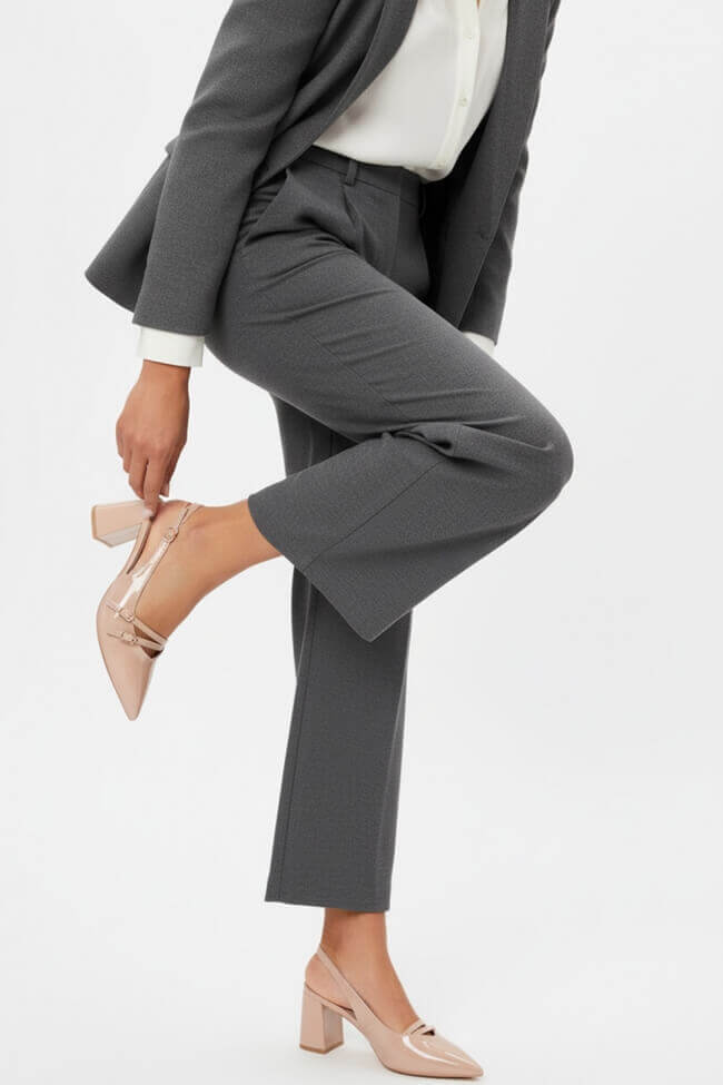 La birou: Pantofii cu toc jos sunt ideali pentru apariții profesionale, adăugând o notă elegantă fără a obosi picioarele. Se combină perfect cu pantaloni croiți și fuste pentru un look office elegant.