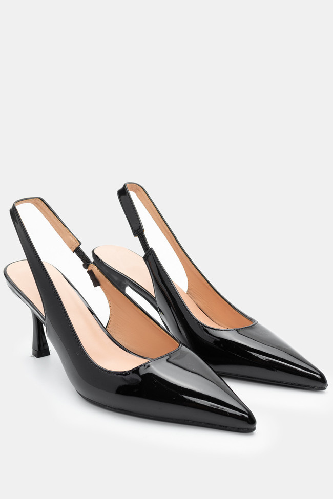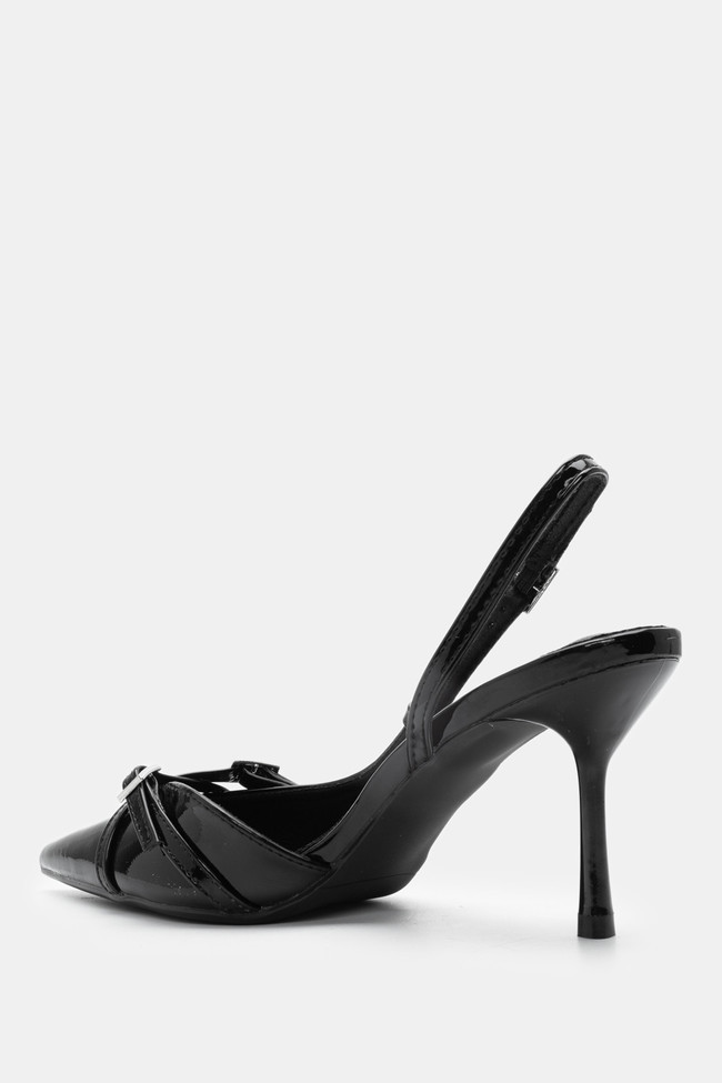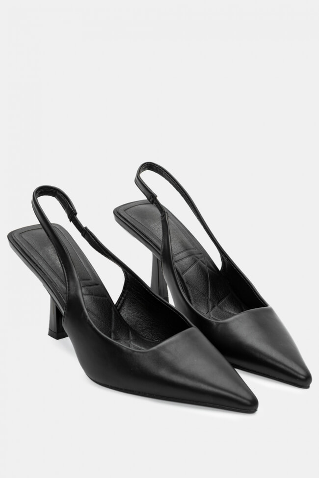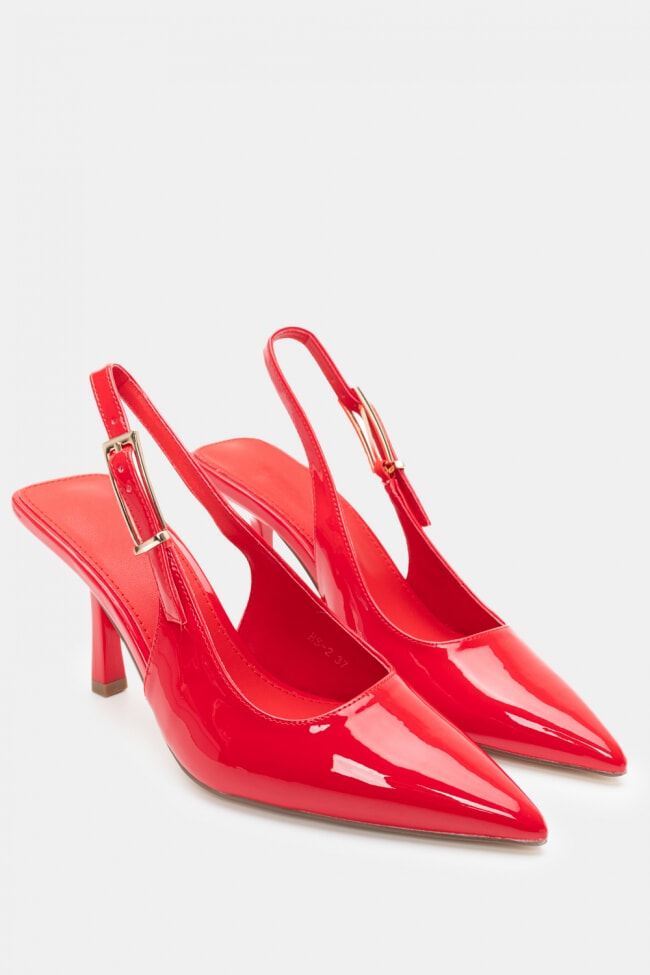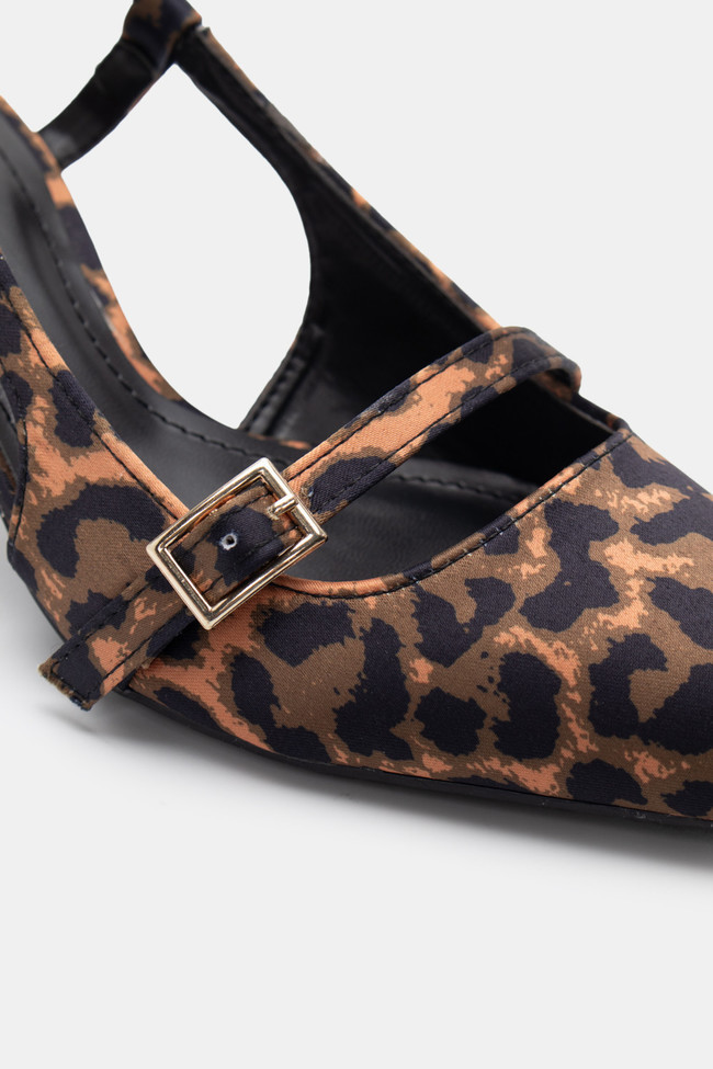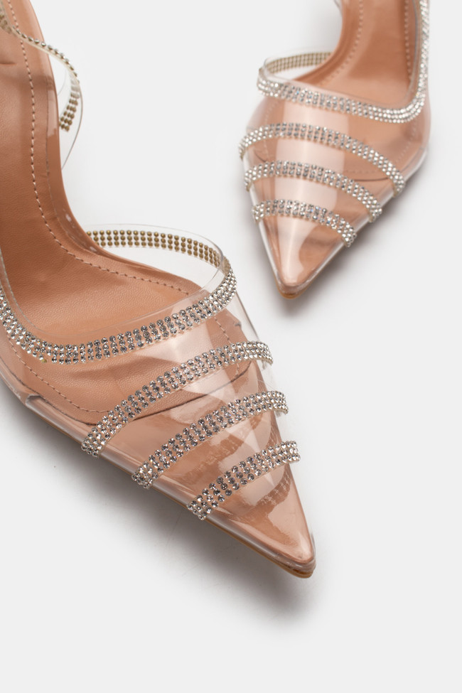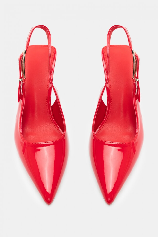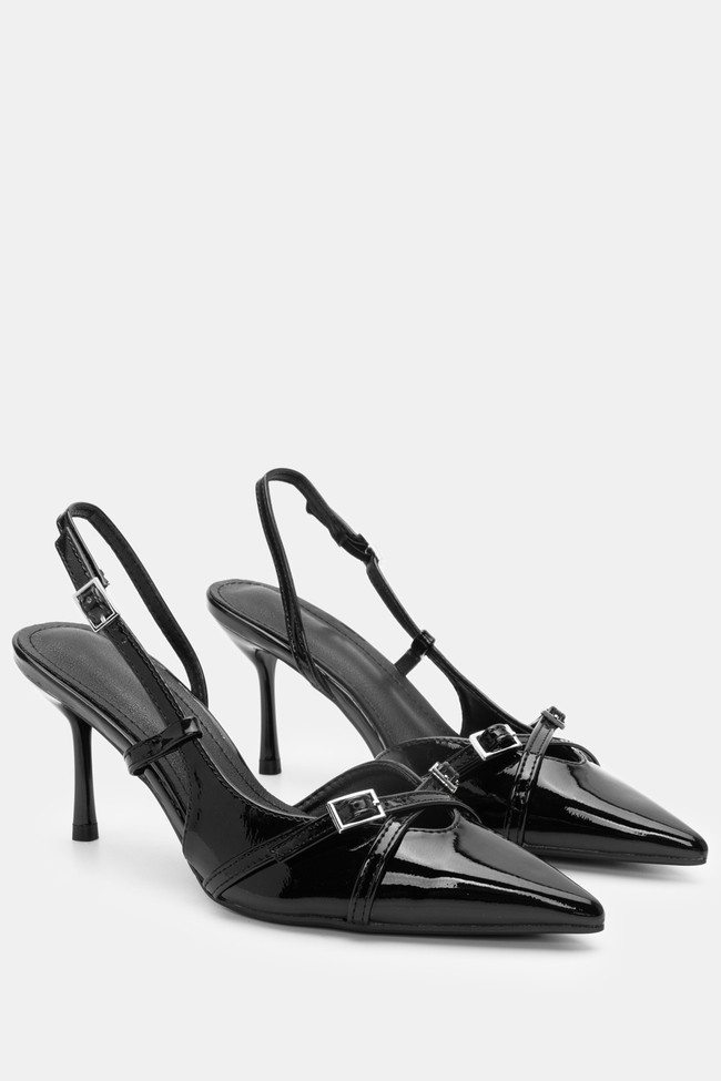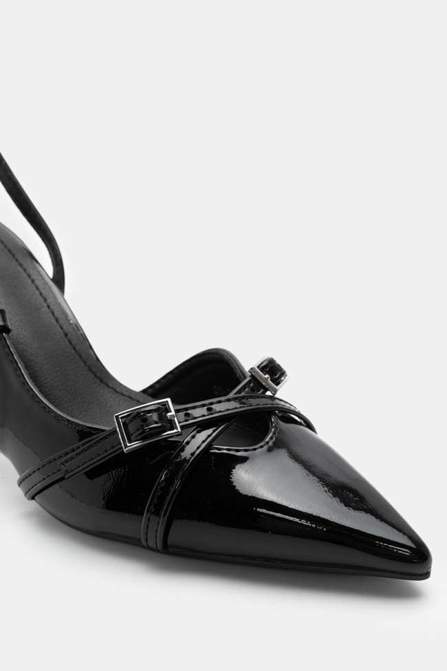 Pantofi cu toc deschis, cu vârf ascuțit și curea decorativă