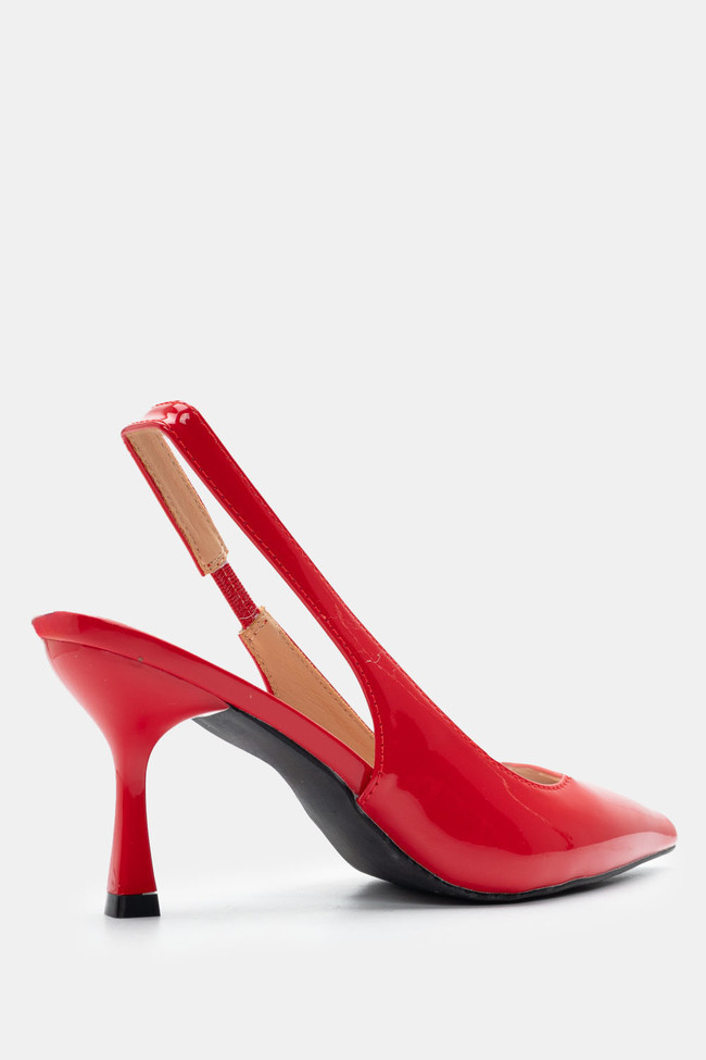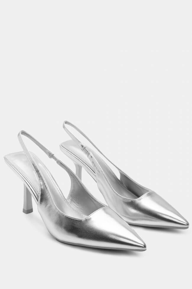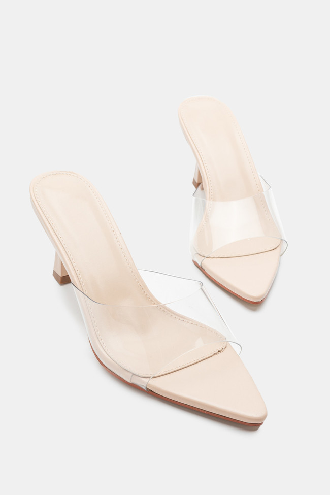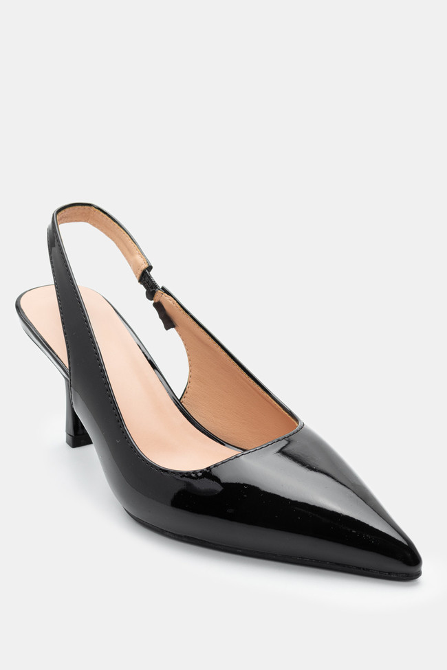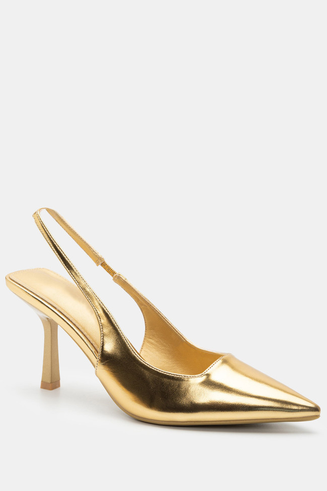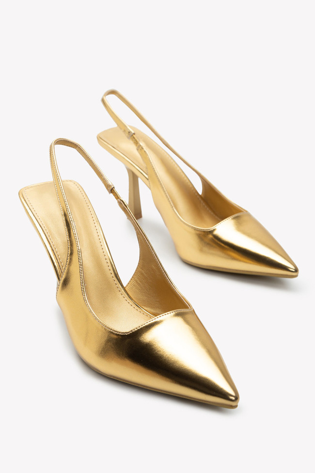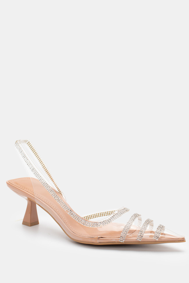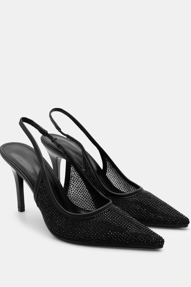 Pantofi cu toc deschis, cu vârf ascuțit și curea decorativă