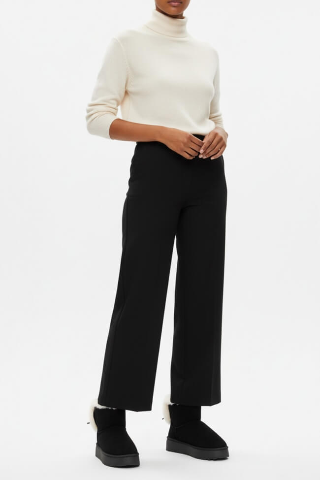- С панталон от плат: Ботинките с кожа се съчетават перфектно с широк платен панталон, голям кожен колан и дълго палто.